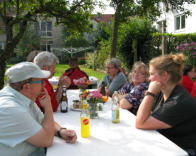 Heydenmühle Fotogalerie Ein Pferd und Reiter Heydenmühle Garten fünf sizende Handwerker zwei Reiter und Pferd drei Menschen am Tisch